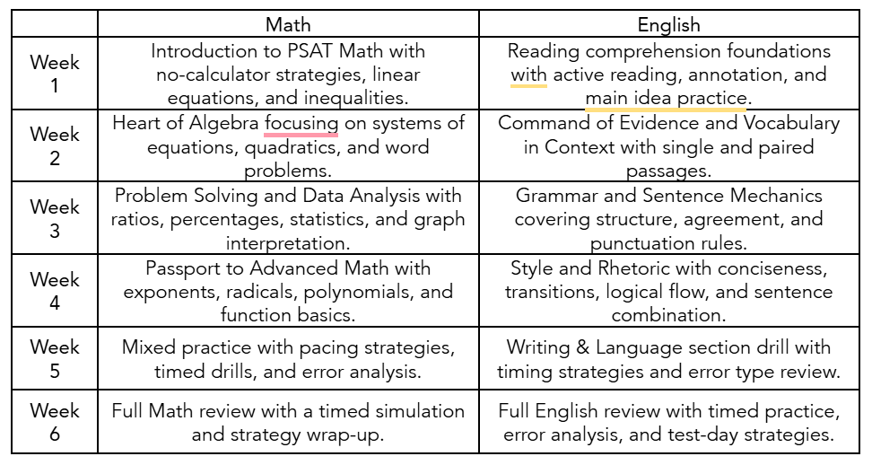 Our SAT course is a standard 8 weeks course. We also offer a shorter PSAT course which is covered in 6 weeks.